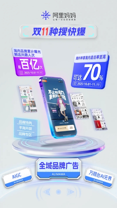 淘内「品牌广告」 同样表现亮眼。10月1日至11月11日期间,淘内品牌累计曝光触达兴趣人次超百亿次 ,引导过亿兴趣进店;淘外种草淘内追击率至高可达70% 。其中,「品牌特秀」 实现100%精准人群定向,显著提效种搜一体,转化效率大幅提升,ROI远超常规投放;100+行业头部品牌叠加「竞争突围」 能力,累计实现26亿次 排竞曝光,有效抢占同行业品牌流量,强化品牌心智占位。