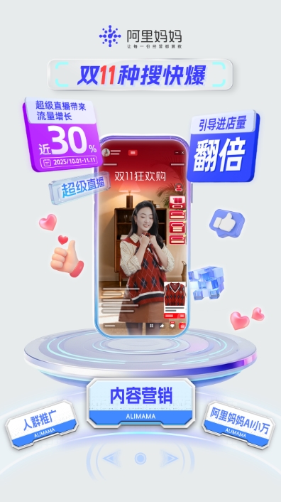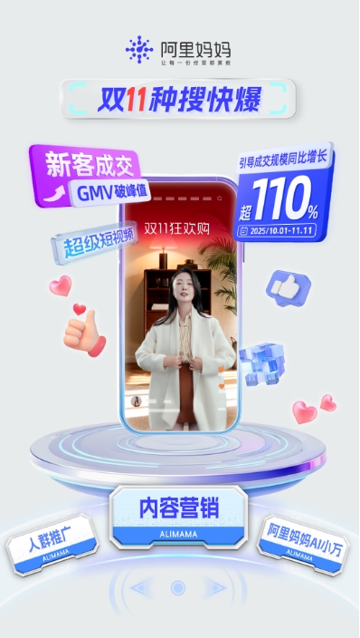 其中,「AI即刻成片」 依托全新行业人设、数字人成片、首尾帧能力,助力快消、服饰等行业头部品牌降本增效,实现平均点击率提升40%+ 、有效观看率提升90%+ 、成交转化率提升100%+ 。「AI百变制图」 助力商家进行爆款素材批量生产,双11期间助力3C数码、美妆、家清/个护、母婴亲子、家居等行业商家,实现点击率提升30%+ ,加购率提升25%+ 。「AI淘积木」 全新裸眼3D视觉交互助力家享、运动户外等行业头部品牌实现平均点击率提升8% 、加购率提升70% 、回访率提升70%+ 。