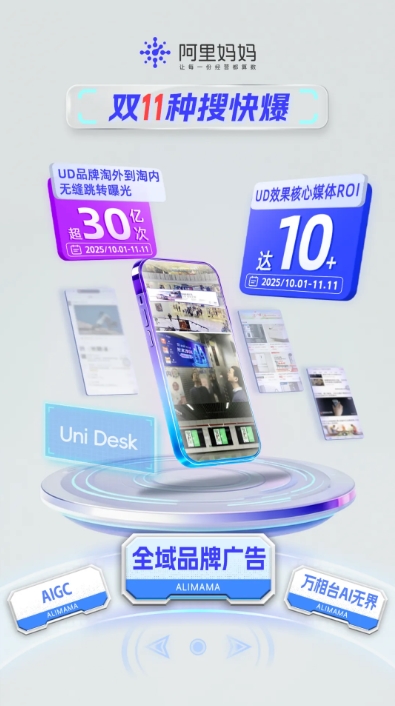 阿里妈妈打造的一站式站外推广投放平台Uni Desk,为商家聚合优质媒体资源,精准推动生意转化:「UD品牌」 为用户创造超30亿次 无缝跳转体验,实现从推广曝光到淘内转化的高效闭环,同比增长超30% ,推动品牌成交金额增长近20% 。「UD效果」 全域媒体百花齐放,为商家精准引流助力成交,整体引流人次达16亿 ,其中核心媒体渠道重点升级了单品/全店成交模型效果,投产ROI达10+ ;新增的新客、加购等细分营销优化能力,持续为商家拉动全域媒体的经营增长力。