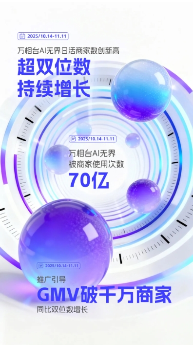 今年双11大促全周期(10月14日至11月11日),推广引导GMV破千万商家同比实现双位数增长 !伴随首个AI全面落地的双11,万相 台AI无界作为商家的“超级经营智能体”,已成为商家经营增长的重要驱动力:大促全周期内,日活商家数创新高,超双位数持续增长 ;商家调用次数超70亿 。10月1日至11月11日期间,通过万相台AI无界投放的货品同比增长超双位数 。