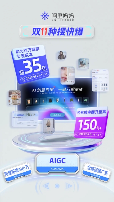 值得关注的是,备受商家好评的AI工具全方位助力大促经营提效。AIGC助力百万商家节省成本超35亿 ,阿里妈妈AI小万助力商家拿量增长超30% ,ROI增长超40% 。