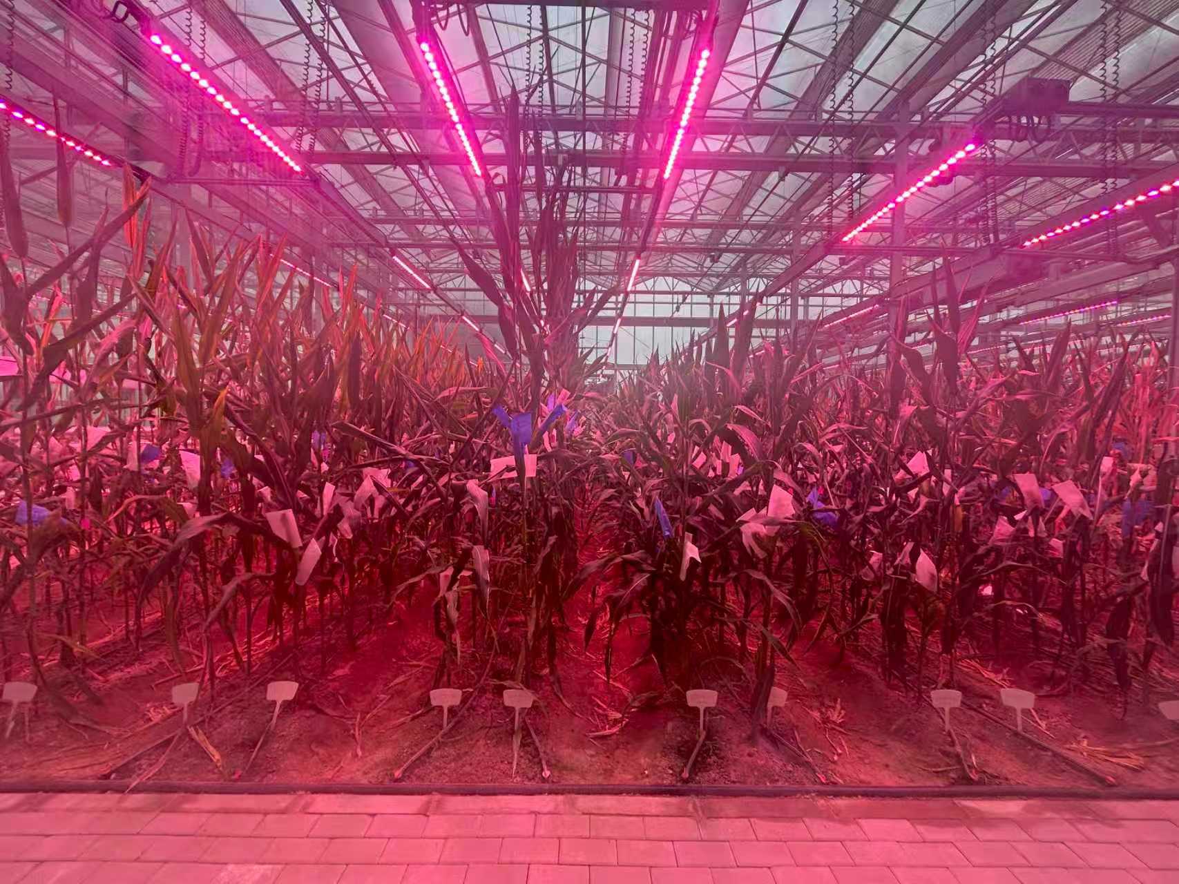 如果说高通量分子育种像是一双“火眼金睛”,能在基因的海洋里迅速找到有用片段,那么育种加速器就是为潜力种子的生长按下了“加速键”。在国际种业科技园区的农作物育种加速器内,一个个全人工光生长室整齐排列,架子上的玉米挺拔生长,盆里的小麦苗生机勃勃。不同作物分住在不同“小单间”,享受定制化的生长环境。