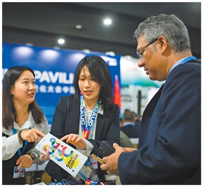 《联合国气候变化框架公约》第二十九次缔约方大会期间,工作人员向参加“生态文明与美丽中国实践”主题边会的嘉宾介绍情况。 |