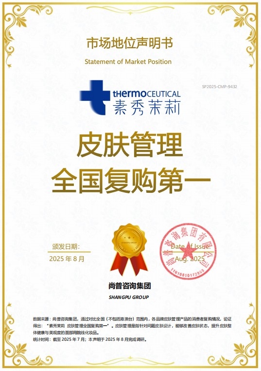 2025年,尚普咨询集团为素秀茉莉颁发市场地位声明书。此次素秀茉莉荣获尚普咨询【素秀茉莉 皮肤管理全国好评第一】【素秀茉莉 皮肤管理全国复购第一】市场地位声明,标志着素秀茉莉在皮肤管理行业细分领域中的领导地位及市场的高度认可。
