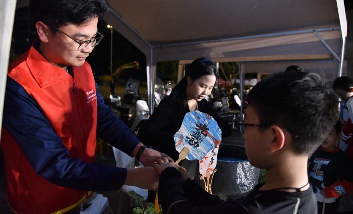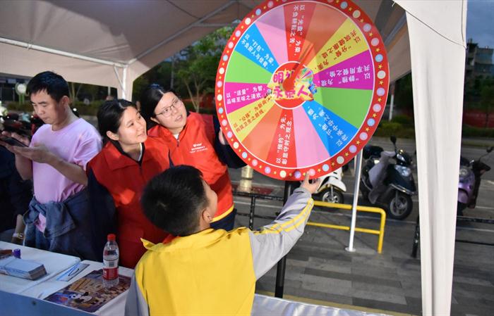 活动现场,巨大的“文明餐桌”宣传展陈率先吸引了不少家庭驻足打卡。互动游戏区更是热闹非凡,供电公司的青年志愿者们现场讲解“光盘行动”“公筷公勺”等文明用餐知识,引导群众开展“文明餐桌转盘”等互动游戏。在投壶游戏前,居民们瞄准箭壶投掷箭矢;在沙包游戏区,大人小孩组队齐上,欢声笑语不断。而定制的非遗漆扇制作区更是排起了长队——扇面一面流淌着水墨风光,另一面印着文明餐桌的宣传用语,让居民在体验传统乐趣的同时,强化了文明理念。