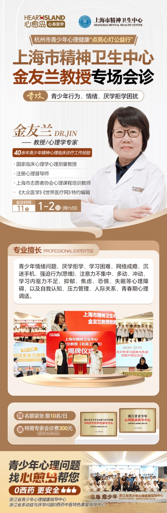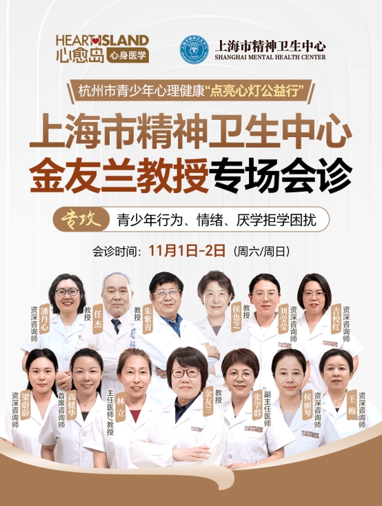 11月1日-2日(本周六/日) ,上海市精神卫生中心儿童青少年心理科权威专家金友兰教授将再度来杭,开展心灵之约专场会诊。针对复杂个案提供深度问诊,制定个性化干预方案。这对很多来访者及家属来说非常难得,不用奔波上海,就可以得到多专家的诊疗意见。