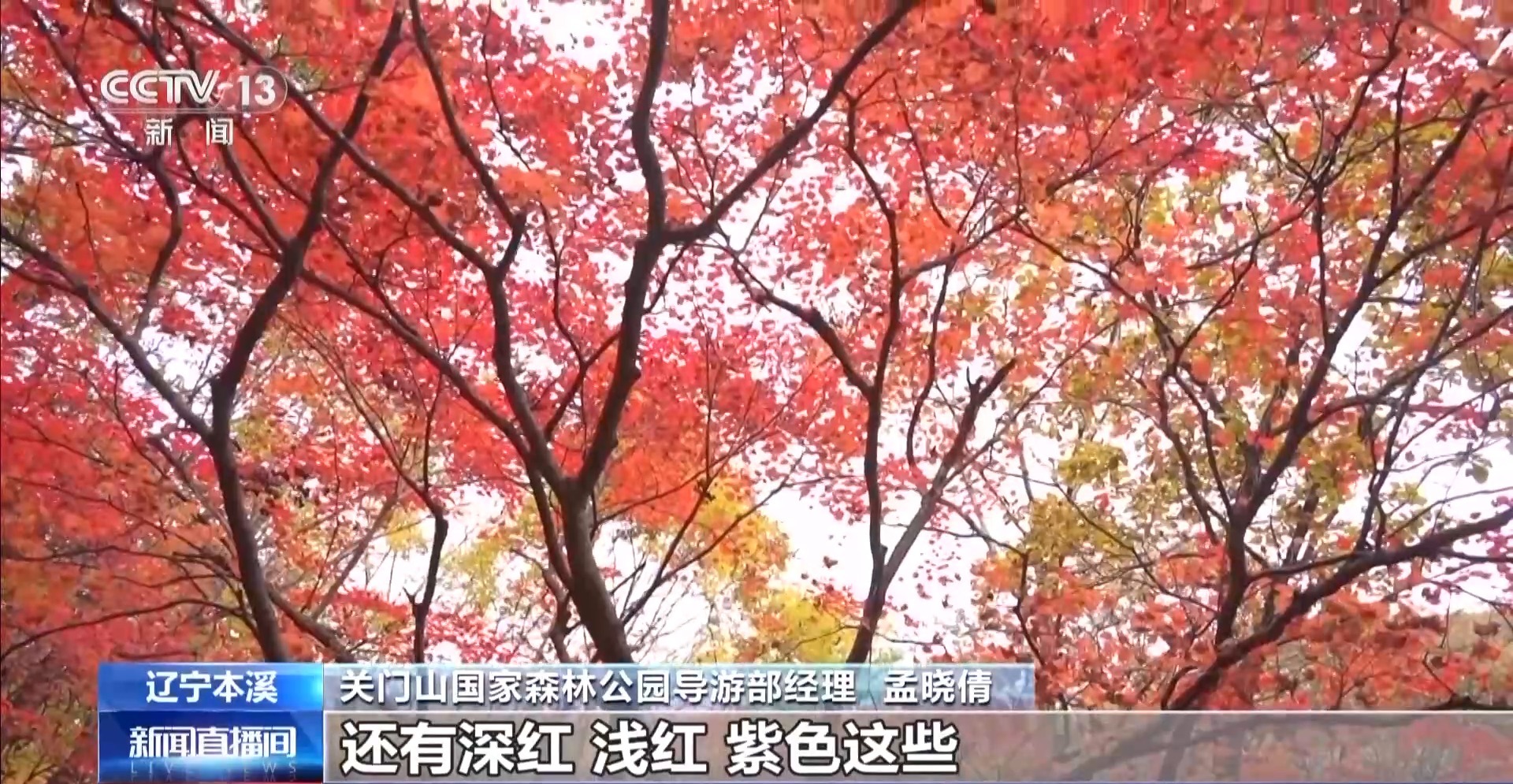 关门山国家森林公园导游部经理 孟晓倩:我们这里的枫叶主要都是槭树的一种,颜色就是有黄色、橘色、深红、浅红、紫色这些。