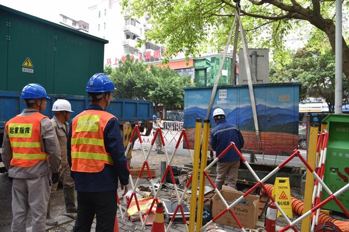 施工人员指挥环网柜吊装过程(谢仁/摄)