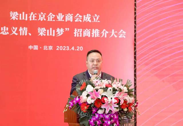 4月20日下午,梁山在京企业商会成立暨“忠义情、梁山梦”招商推介大会在北京举行,梁山县委书记谷永强,济宁市工商联党组成员、副主席王浩,济宁市驻京联络处主任冯延宁,梁山县委常委、统战部长周菊兰,梁山县委常委、办公室主任、政法委书记张林勇,梁山县人大常委会副主任、工商联主席司开阳,梁山县经济开发区党工委书记、管委会主任李莱茵出席会议;部分在京梁山籍老领导、北京市海淀区工商联领导、北京山东企业商会、北京济宁商会、河北山东商会等商会负责人和部分知名企业家受邀出席会议;北京梁山博士联盟成员,有关县直部门、乡镇(街道)主要负责同志,梁山在京企业商会全体会员等近300人参加会议。