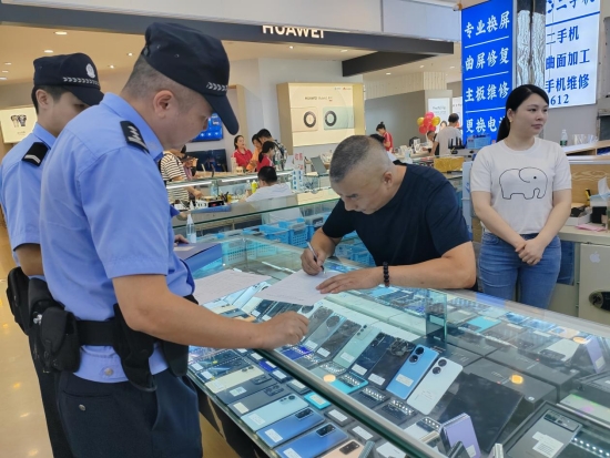 民警与商家签定二手物品依法交易承诺书。邵勇 摄