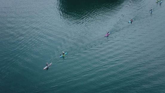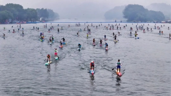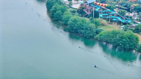作为国内最长距离的桨板赛事,33公里的赛道从不是简单的距离叠加,而是一条串联丽水精华风光的“水上画廊”。从艺术气息浓郁的古堰画乡出发,桨板划过千年通济堰的碧波,青石板老街的烟火气随江风扑面而来;途经九龙湿地时,满目苍翠间常有白鹭惊起,原生态芦苇荡在船侧划出涟漪;掠过冒险岛的欢乐浪涛后,南明湖的粼粼波光与城市天际线相映,勾勒出 “城在水中、水在城中”的绝美图景。