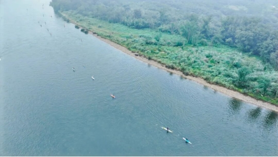 当赛事推进至九龙湿地,眼前的风光瞬间切换为 “原生态模式”。成片的芦苇荡沿江岸铺展,翠绿的芦叶在风中摇曳,偶有白鹭从芦苇丛中起飞,展开翅膀掠过江面,与选手的桨板形成一动一静的画面。