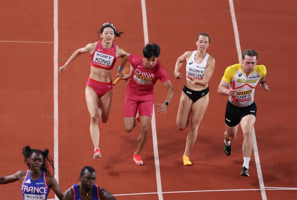 15日晚,在广东奥体中心举行的田径项目首个比赛日中,4×400米混合接力和4×100米混合接力都产生了金牌。但这两个混合项目在交接棒次序上有所不同,4×400米混合接力是“男女男女”的次序,4×100米混合接力则采用“女女男男”的次序。
