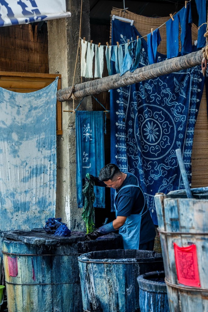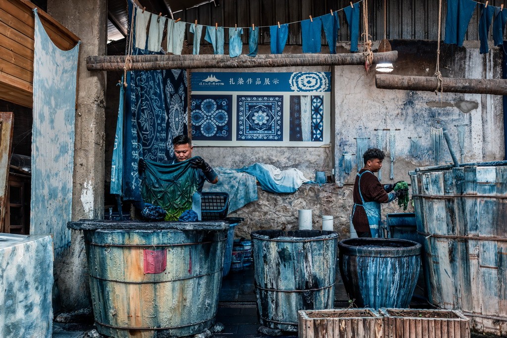 白族扎染以板蓝根为主要染料,工序包含绘图、制版、印花、扎花、染色、漂洗、拆花、晾晒等。其中,扎花、浸染为核心步骤,手工艺人执针走线,在布料上扎出不同类型的图案,再用植物染料染出蓝底白花、生灵百态。2006年,白族扎染被列入第一批国家级非物质文化遗产名录。新华社记者 胡超 摄