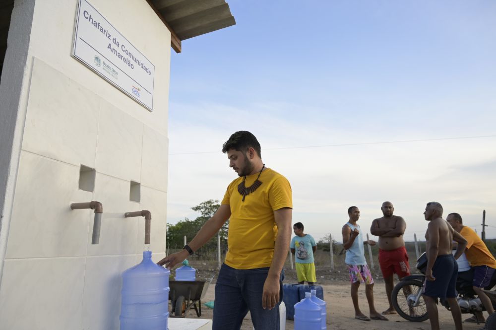 2月14日,在巴西北里奥格兰德州若昂卡马拉市,当地居民在中国国家电网公司巴西苦咸水淡化公益项目社区取水点取水。中国国家电网公司巴西苦咸水淡化公益项目2月16日正式移交巴西北里奥格兰德州政府。该项目日均可产80吨纯净水,并通过输水管道送至附近三个原住民社区,供800多个家庭共计3000余名居民使用。新华社记者 陈昊佺 摄