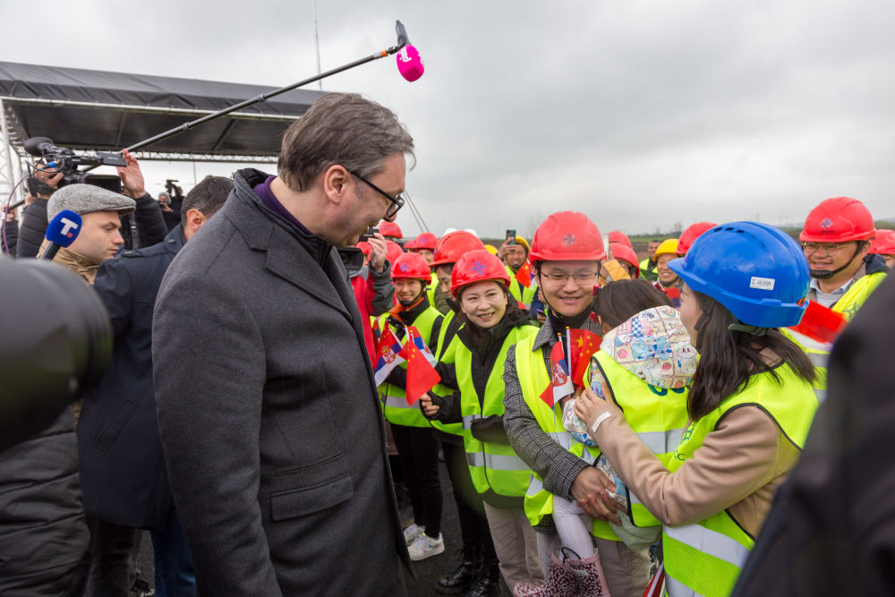 4月1日,塞尔维亚总统武契奇(左)在塞首都贝尔格莱德出席塞尔维亚E763高速公路新贝尔格莱德-苏尔钦段通车仪式。新贝尔格莱德-苏尔钦路段是E763高速公路的起始段,全长7.9公里,由中国交通建设集团有限公司承建。该路段通车后,E763高速公路通车总里程已达140公里,其中约87公里由中国企业承建。E763高速公路全长约300公里,是塞尔维亚连接黑山出海口的重要通道,也是连接巴尔干地区与周边国家的运输大动脉。新华社记者 石中玉 摄