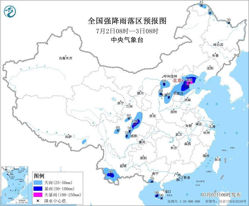 预计,7月2日8时至3日8时,山西中北部、河北中南部和东北部、北京大部、天津、山东北部、四川盆地西北部、甘肃东南部、陕西西南部、云南西南部、广西南部沿海、海南岛西南部、黑龙江西北部等地部分地区有大到暴雨,其中,河北东北部、天津中东部、四川盆地西北部等地局地有大暴雨(100~160毫米)。