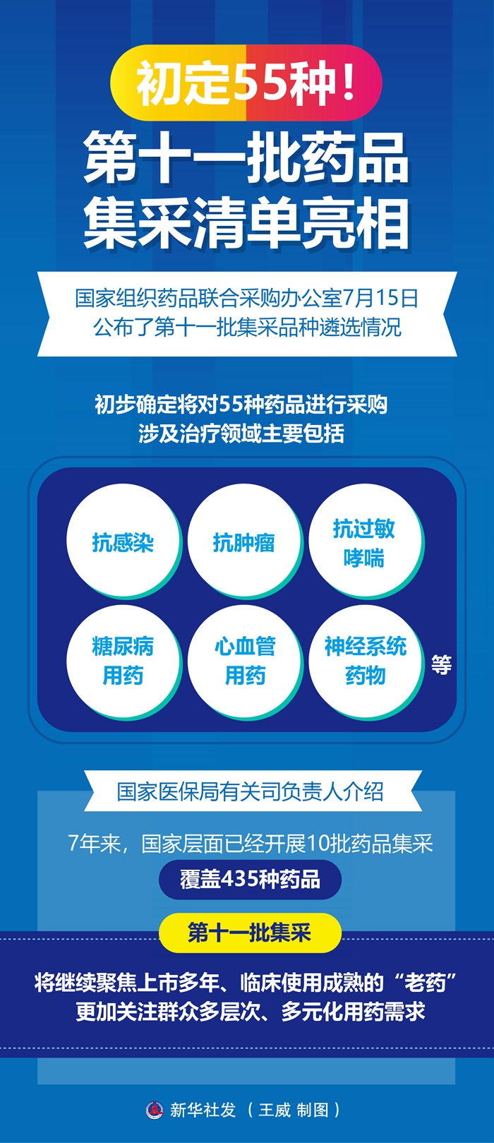 “新药不集采、集采非新药。”国家医保局有关司负责人介绍,7年来,国家层面已经开展10批药品集采,覆盖435种药品,第十一批集采将继续聚焦上市多年、临床使用成熟的“老药”,更加关注群众多层次、多元化用药需求。