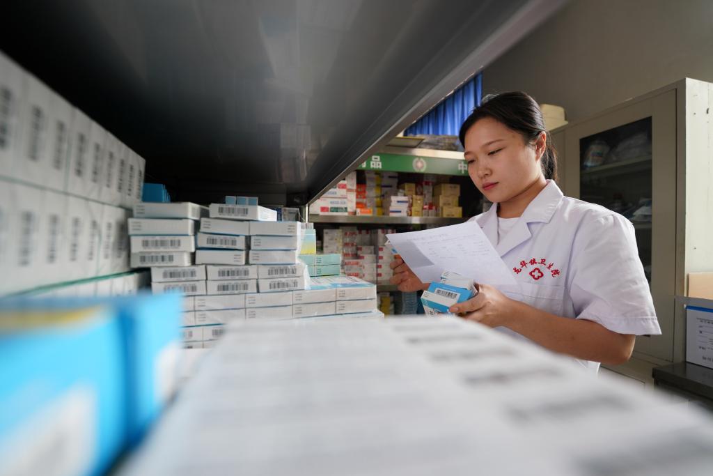 河北省柏乡县龙华镇卫生院药房工作人员在为患者取药。新华社记者 牟宇 摄