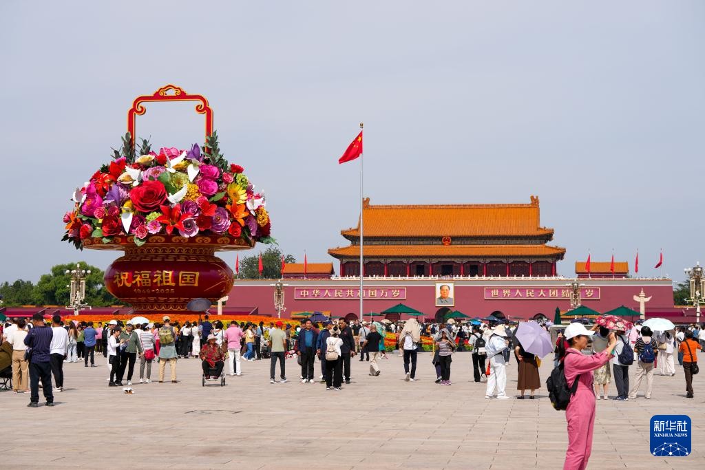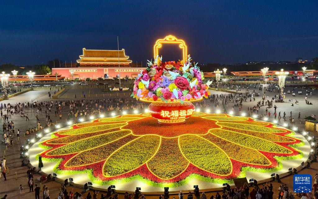 9月25日,2025年“祝福祖国”巨型花篮正式完工,亮相天安门广场与市民共度佳节。今年“祝福祖国”花坛以喜庆的花篮为主景,花坛顶高18米,篮体高16米,篮盘直径12米。篮体南侧书写“祝福祖国”“1949-2025”字样,篮体北侧书写“欢度国庆”“1949-2025”字样。篮内选取了美好寓意的花卉,其中荷花寓意“和和美美”、橄榄枝寓意“荣耀和平”等,还结合和平鸽元素,体现“和平发展、欣欣向荣”。
