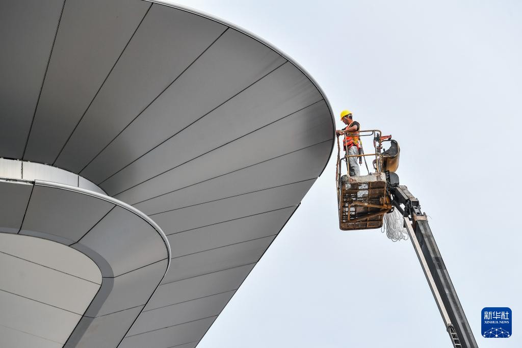 10月2日,在湖南长沙机场改扩建工程T3航站楼施工现场,中建五局不二幕墙公司工人在安装吊顶胶条。新华社记者 陈思汗 摄