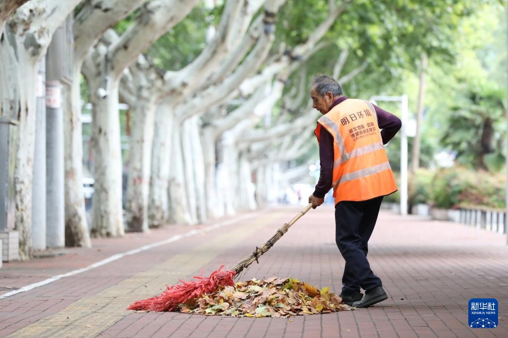 10月2日,一名环卫工人在河南省焦作市温县街头清扫落叶。 新华社发(徐宏星 摄)