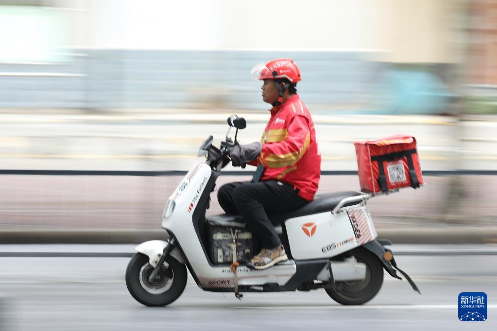 10月2日,一名外卖员在河南省焦作市温县街头骑行,为顾客送餐。新华社发(徐宏星 摄)