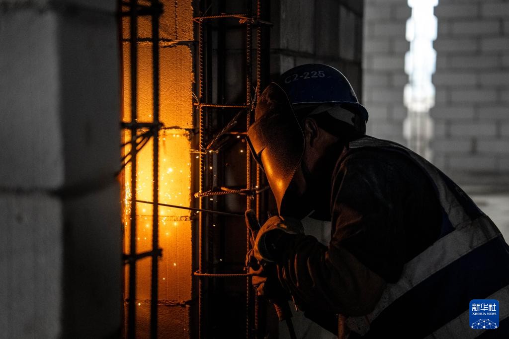 10月2日,中建三局工人在河南郑州航空港区“两院一中心”项目工地进行挂网作业。新华社记者 李嘉南 摄
