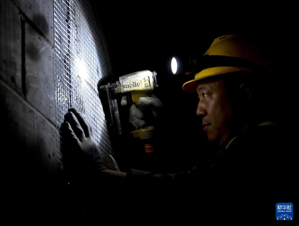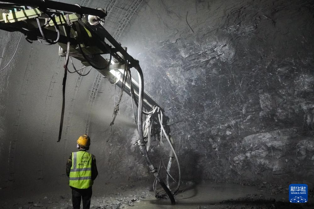 10月2日,中铁二十局的建设者在西渝高铁向阳二号隧道出口进行隧道初期支护喷射砼作业。新华社记者 王曦 摄