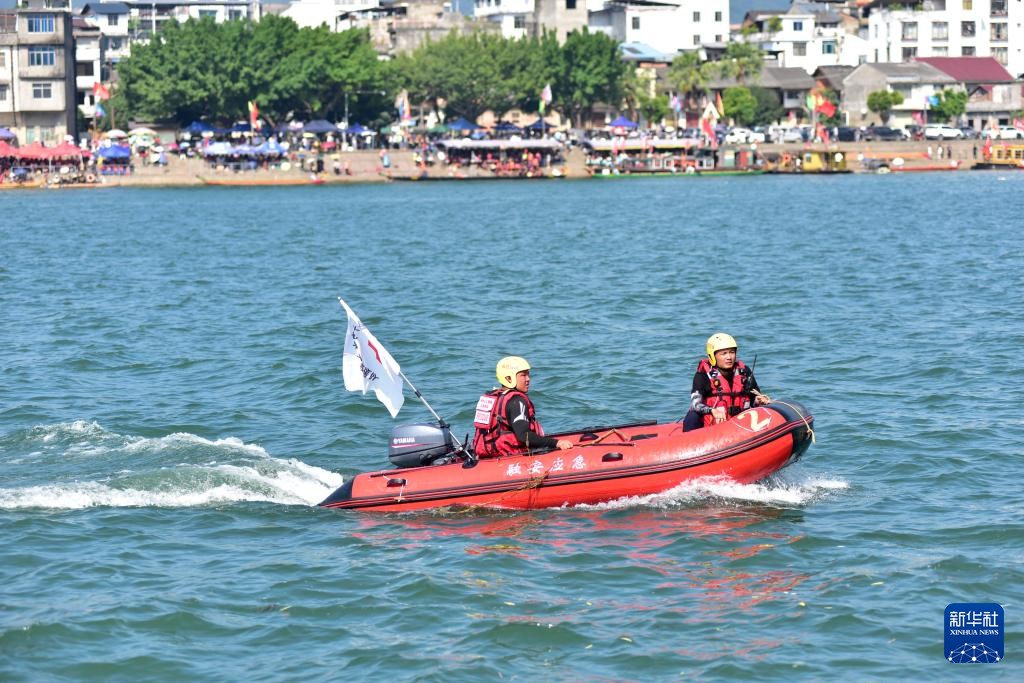 10月2日,广西壮族自治区融安县应急管理工作人员在融江龙舟比赛水域巡逻。新华社发(廖祖平 摄)