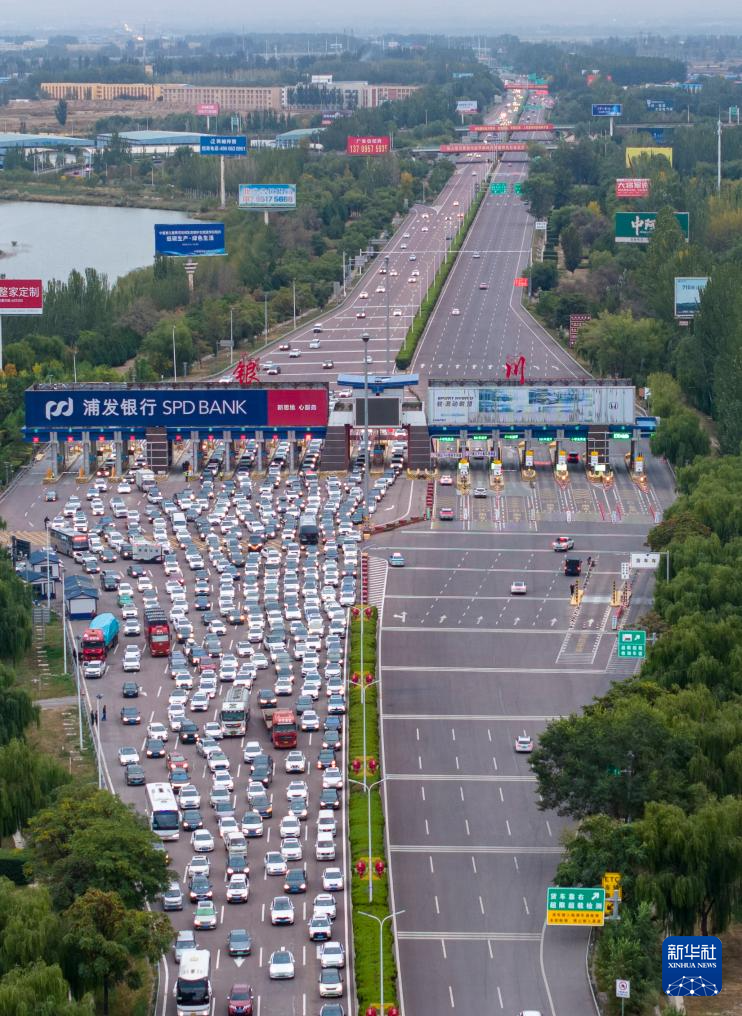 10月7日拍摄的宁夏银川市银川东高速公路收费站车流(无人机照片)。新华社记者 杨植森 摄